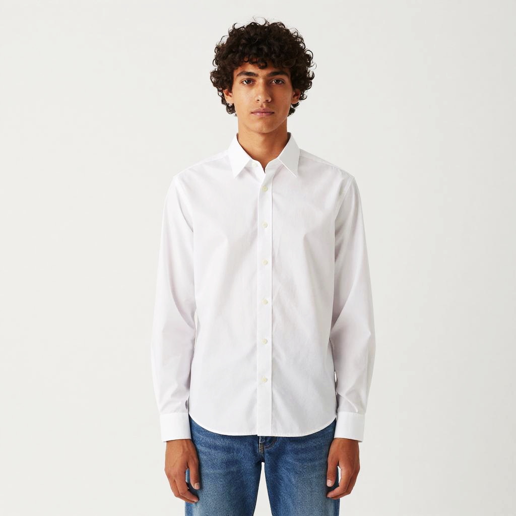 A young man with curly hair stands against a plain white background, wearing a crisp white button-up shirt paired with blue jeans. The minimalist style highlights a clean, modern casual look suitable for both everyday wear and semi-formal occasions.