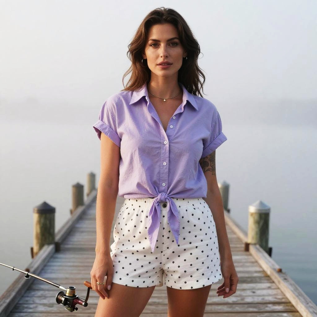 A petite woman stands confidently on a wooden pier surrounded by serene water. She wears a casual summer outfit featuring a lavender button-up shirt tied at the waist and white high-waisted shorts with black polka dots, perfectly capturing a relaxed and stylish summer vibe.