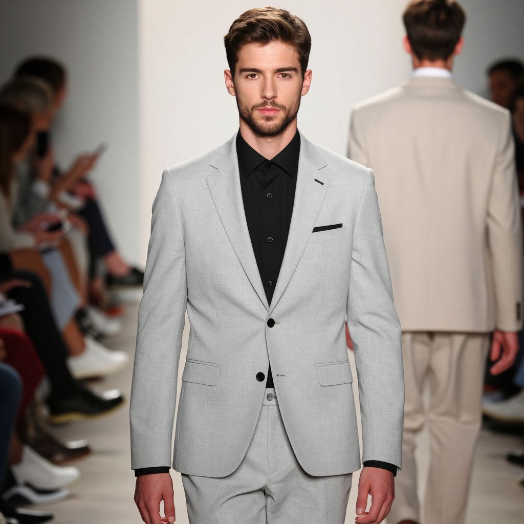 Modern Men's Light Gray Suit with Black Shirt on Runway Fashion Show