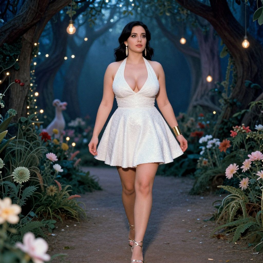 A woman in a white halter dress walks confidently down a fairy-tale-like garden path illuminated by hanging lights and surrounded by colorful flowers and whimsical trees. The scene evokes a dreamy, enchanted atmosphere with soft lighting and lush greenery.