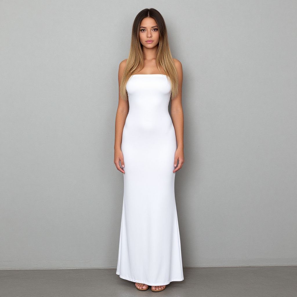 A young woman stands confidently against a plain gray background, wearing a sleek, strapless white gown that flows elegantly to the floor. The minimalist studio portrait highlights her long straight hair and natural makeup, emphasizing modern and clean fashion aesthetics.