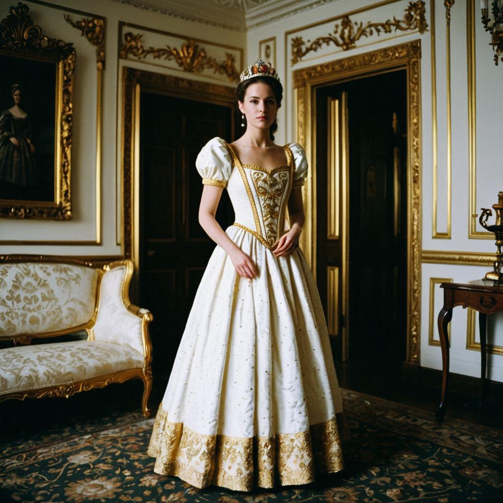 A woman stands elegantly in a richly decorated room, wearing a princess-themed costume that features a white and gold dress with puffed sleeves and intricate embroidery. Her regal appearance is complemented by a jeweled crown and pearl earrings, evoking a classical royal style.