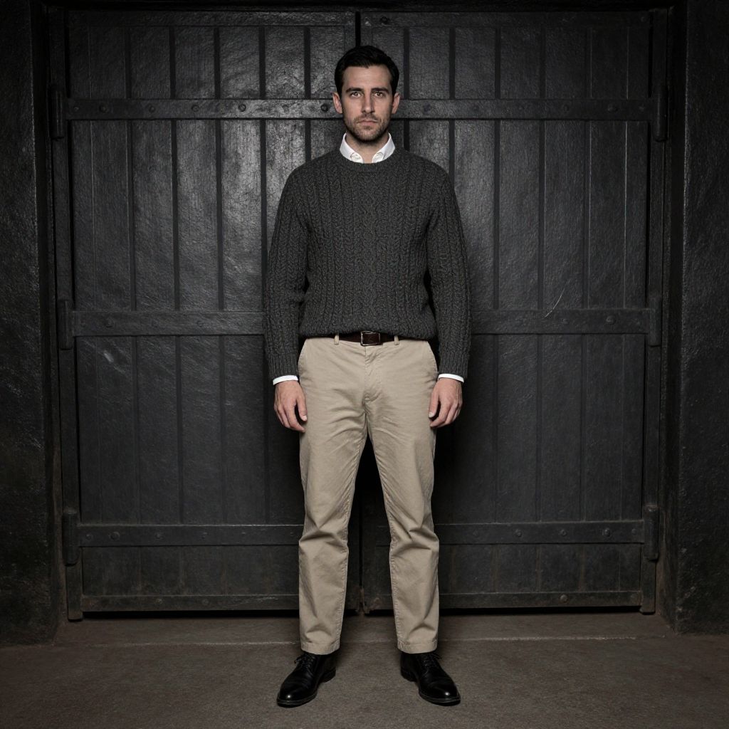 A man stands confidently in front of a large, dark metal door, wearing a textured charcoal sweater over a white dress shirt paired with beige chinos and black dress shoes. The industrial setting contrasts with his smart-casual attire, creating a striking visual balance.