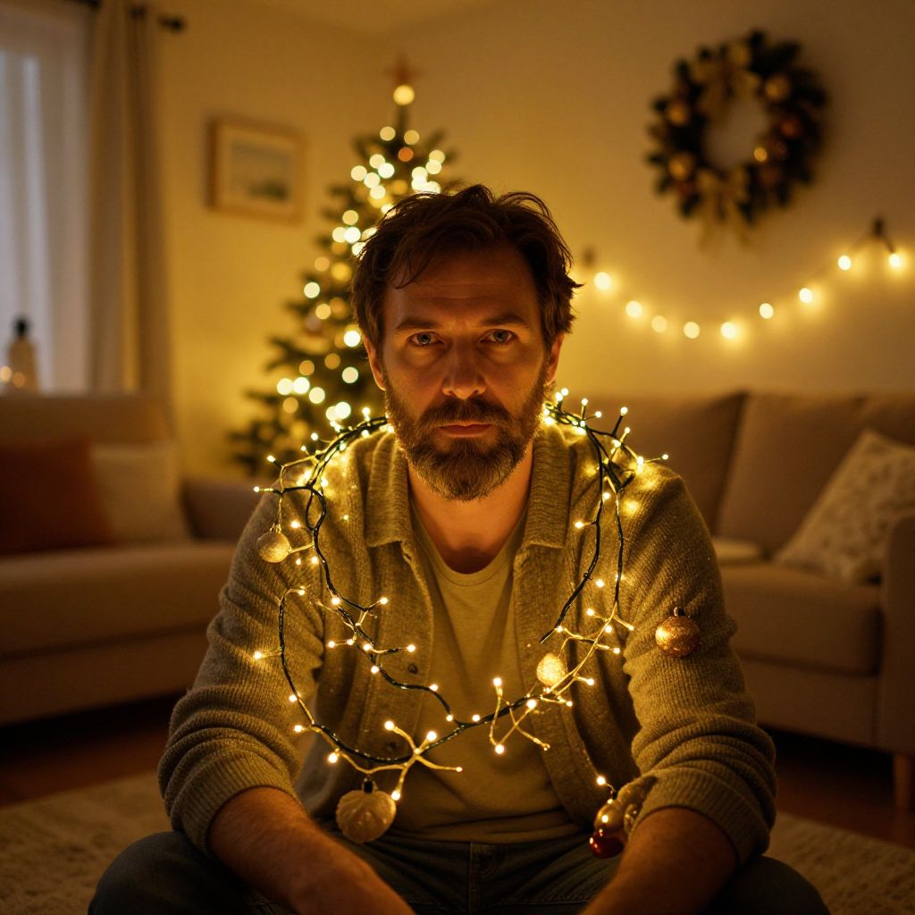 A man with a beard is sitting on the floor, wrapped in warm Christmas string lights, in a cozy living room decorated with a lit Christmas tree and a festive wreath. The image captures a warm, intimate holiday atmosphere with soft, golden lighting and careful composition that enhances the seasonal mood.