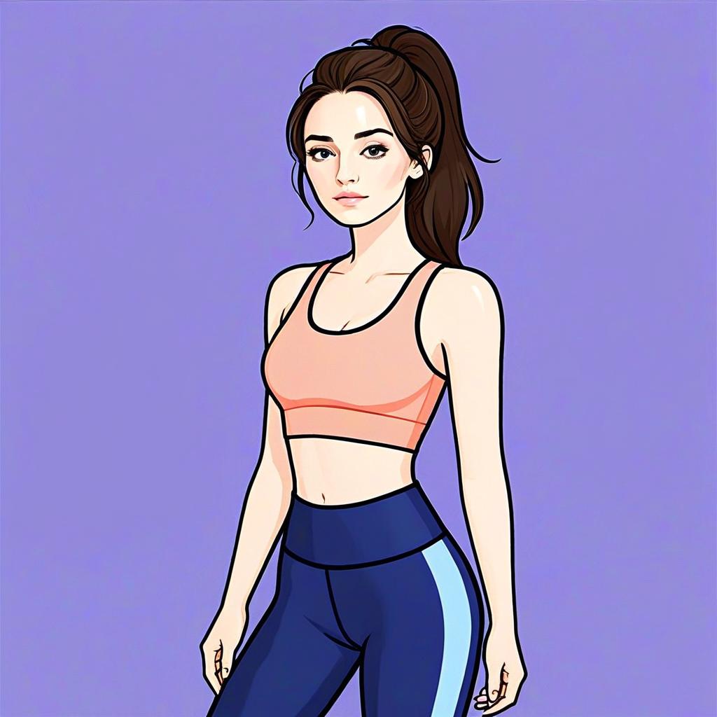 This digital illustration features a woman with a pretty face and voluminous dark hair styled in a ponytail, dressed in stylish activewear consisting of a peach sports bra and navy blue leggings with a light blue stripe. The clean lines and soft shading emphasize her athletic and confident look against a simple purple background, showcasing a modern and minimalistic art style.