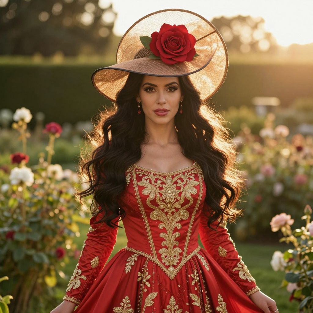 A woman dressed in an elegant, intricately embroidered red and gold gown stands gracefully in a sunlit garden filled with blooming roses. She wears a stylish wide-brimmed hat adorned with a large red rose, complementing her long, flowing dark hair and polished makeup, evoking a classical romantic ambiance.