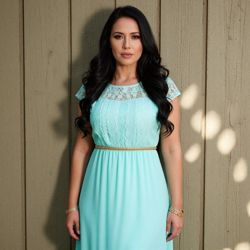 A confident woman with long, dark wavy hair stands against a wooden panel background, wearing a light turquoise dress featuring lace detailing at the neckline and a gold belt accentuating her waist. The natural lighting casts soft, patterned shadows on the wall, enhancing the serene and elegant atmosphere of the portrait.
