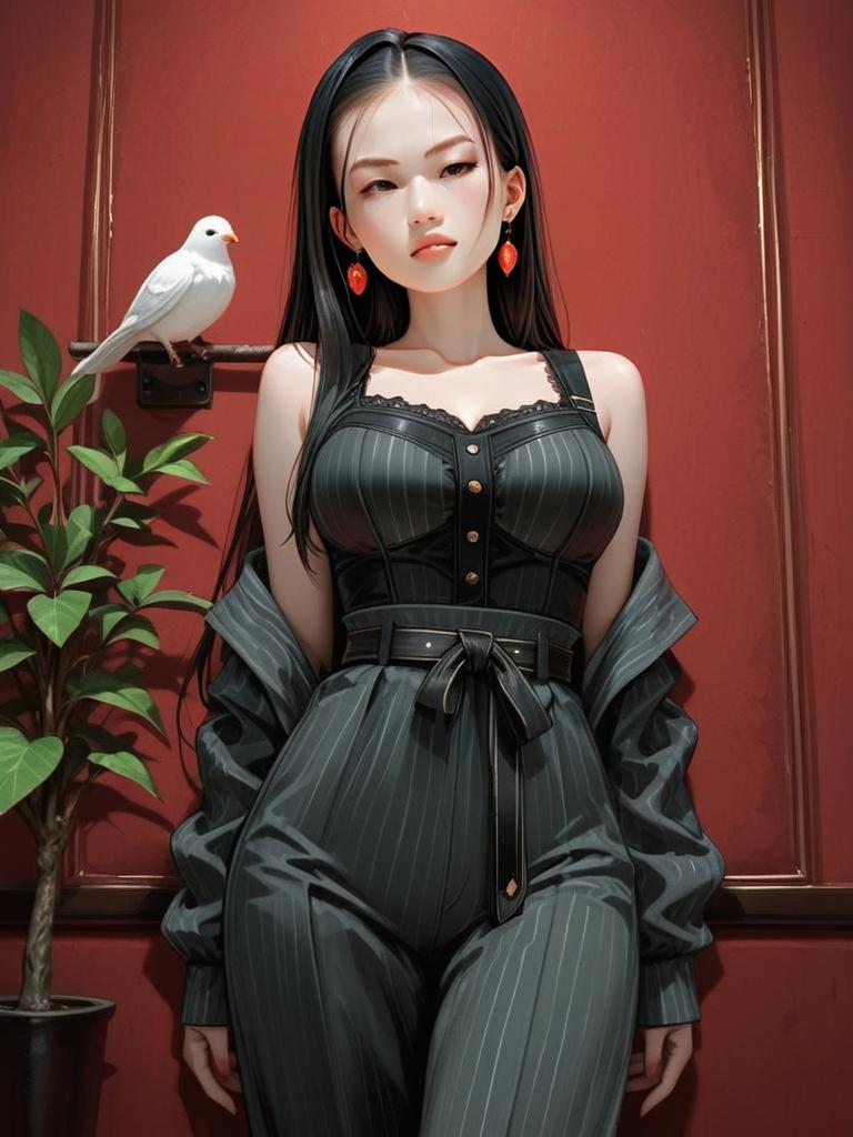 This digital illustration features a confident young woman with long black hair, dressed in a stylish pinstripe outfit combining a fitted corset-style top and high-waisted pants, accented with a tied belt. She stands against a rich red background with a potted plant and a white dove perched on a metal bar, blending realism with a refined anime-inspired artistry.