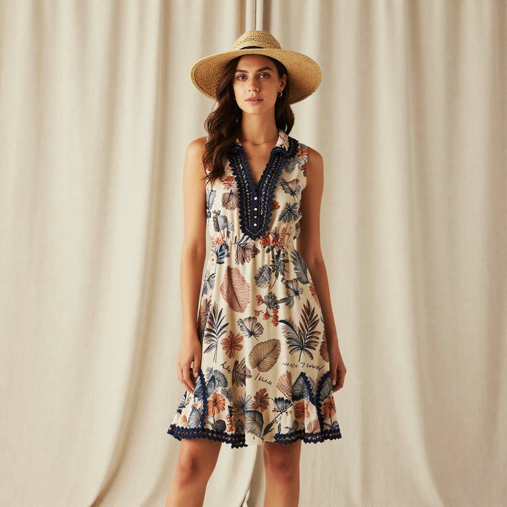 A woman stands confidently wearing a sleeveless western flare dress adorned with a bold leaf and floral print in earthy tones. She accessorizes with a wide-brimmed straw hat, highlighting a casual yet stylish look against a neutral fabric backdrop.