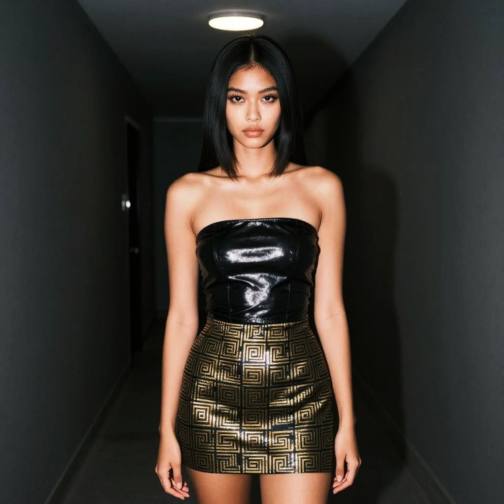 A young woman with sleek black hair stands confidently in a dimly lit hallway, wearing a stylish strapless black leather top paired with a shiny gold skirt featuring a geometric pattern. The photograph highlights her poised expression and modern fashion, embodying a chic Gen Z style.