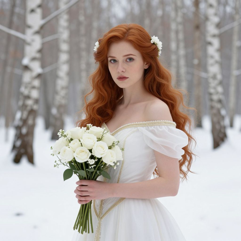 A red-haired woman in an elegant off-the-shoulder white dress stands in a snowy birch forest, holding a bouquet of white roses. The soft natural lighting highlights her serene expression and the delicate flowers adorning her hair, creating a romantic and ethereal winter scene.