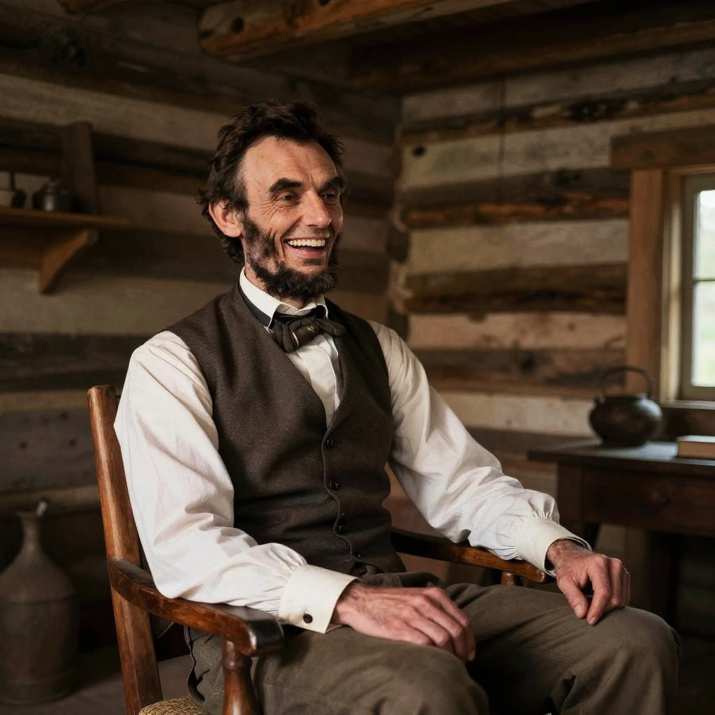 A man dressed in 19th-century attire reminiscent of Abraham Lincoln sits smiling in a rustic log cabin. The warm wooden interior and vintage clothing capture a historical, portrait-style setting with natural light adding to the authenticity.