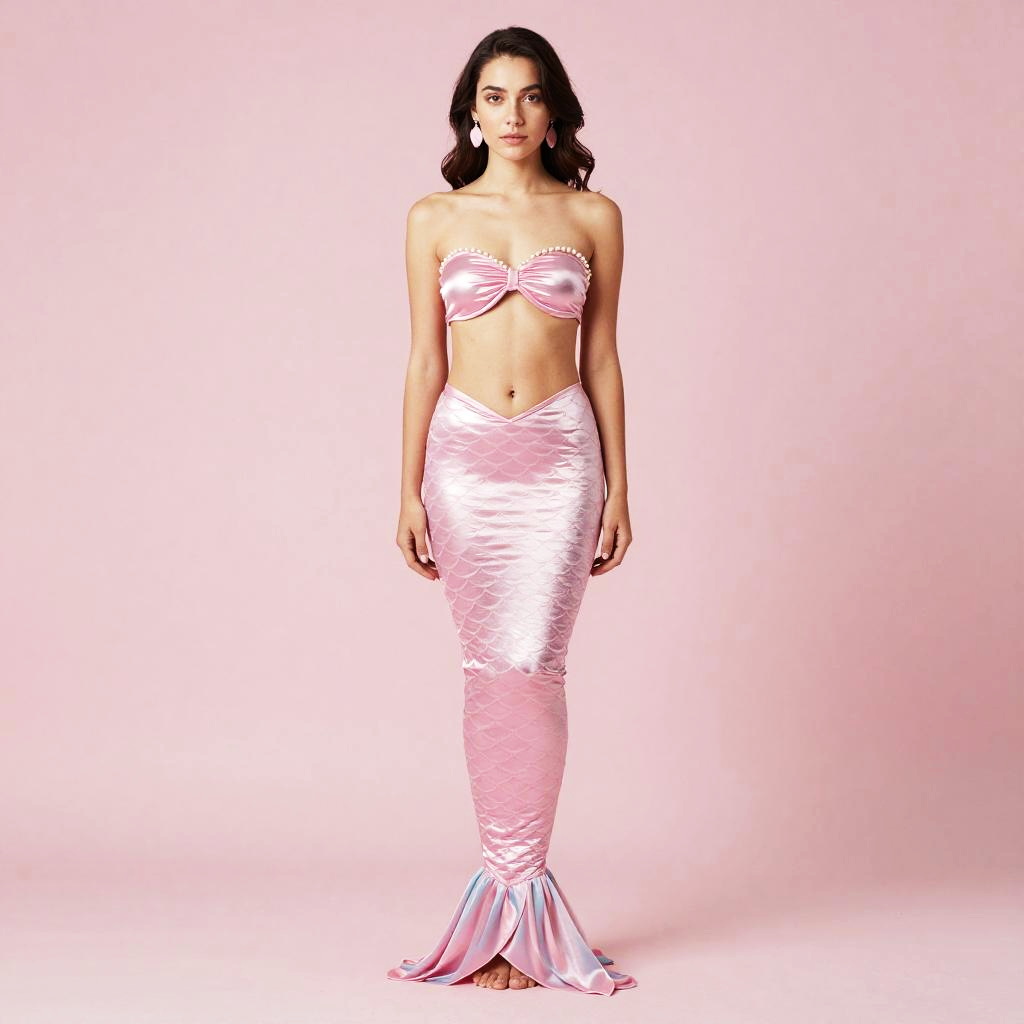 Woman Wearing Pink Mermaid Costume with Pearl Detail and Scale Pattern
