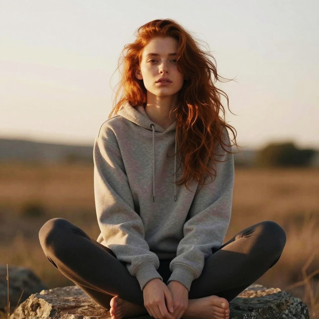 A young woman with long, wavy red hair sits barefoot on a rock in an open field during golden hour, wearing a casual gray hoodie and black leggings. The natural lighting highlights her serene and contemplative expression, perfectly capturing the relaxed and effortless style associated with Gen Z.
