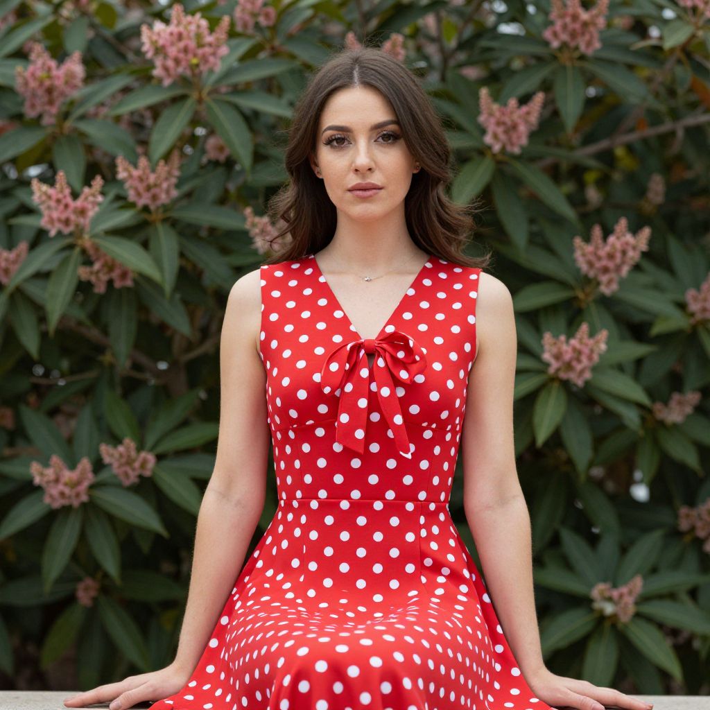 A young woman sits gracefully against a lush backdrop of green foliage and soft pink flowers. She wears a vibrant red sleeveless dress adorned with white polka dots and a stylish bow at the neckline, embodying a classic retro vintage look.
