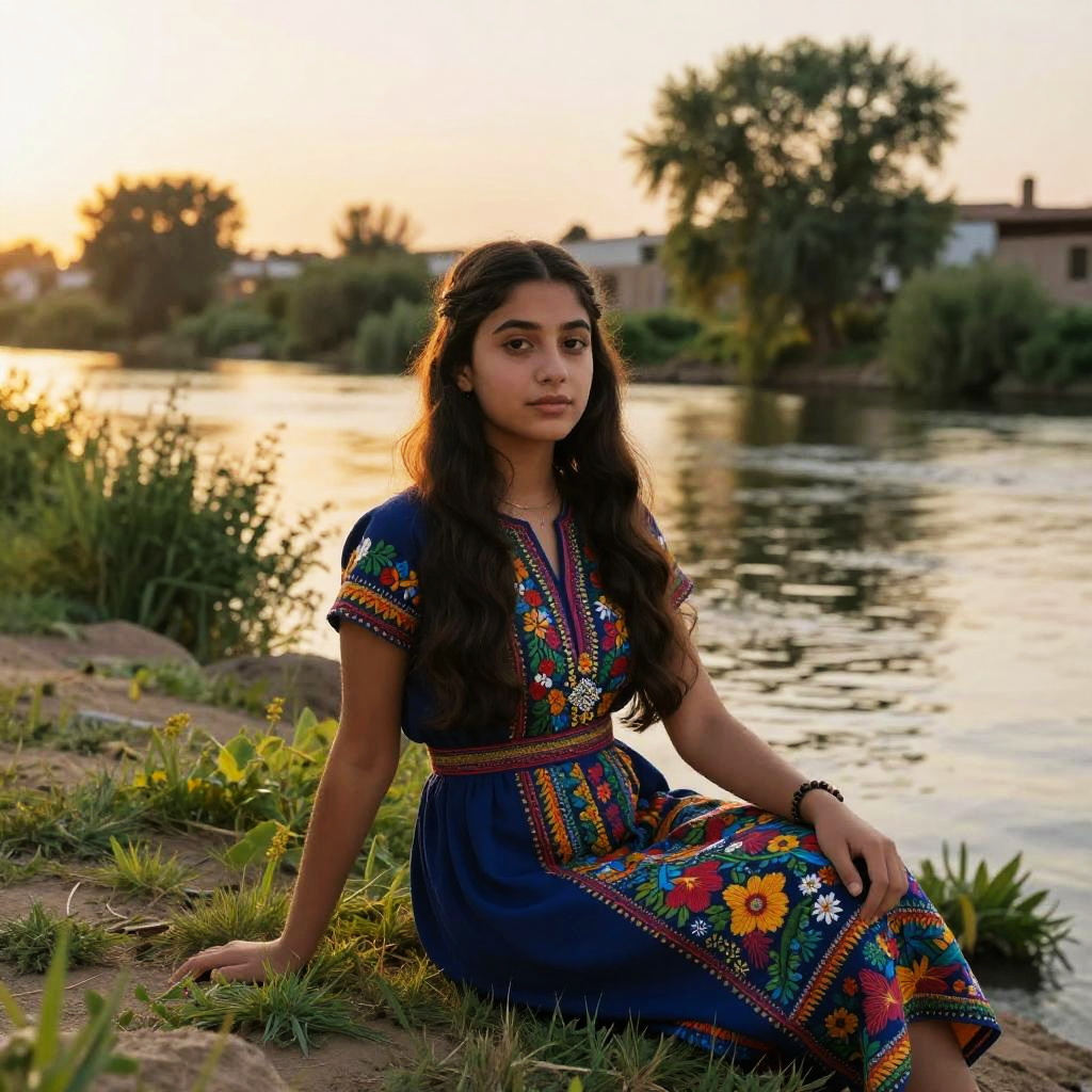 A young woman with long dark hair sits peacefully by a riverside at sunset, wearing a traditional blue dress adorned with colorful floral embroidery. The warm golden light highlights the serene natural surroundings and the calm water, creating a tranquil and contemplative atmosphere.