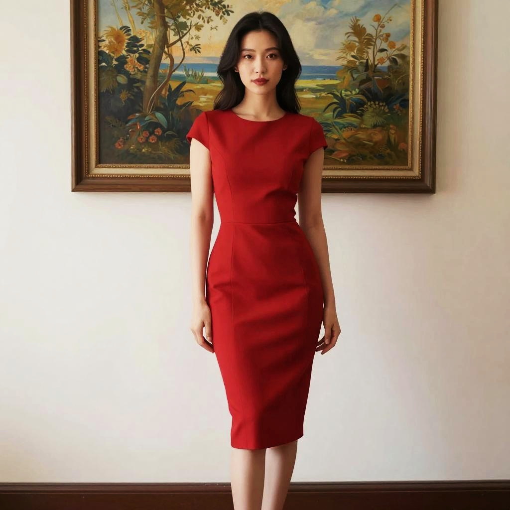 A woman is standing in front of a framed painting, wearing a semi-formal, knee-length red midi dress with cap sleeves. The dress features a fitted silhouette, highlighting a classic and elegant style suitable for formal or business occasions.