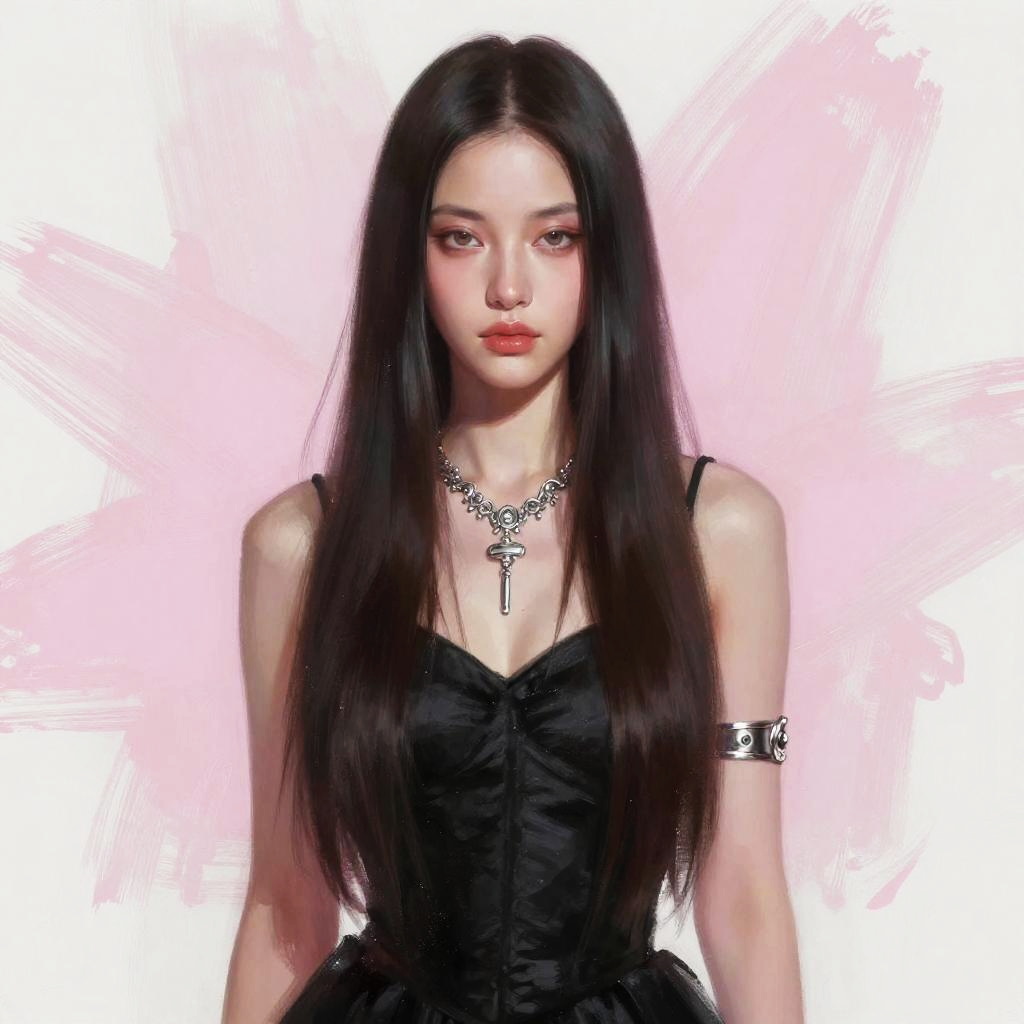 A portrait of a young Gen Z woman with long, straight black hair wearing a sleek black dress. She accessorizes with a striking silver necklace and arm cuff, standing against a soft pink and white painted background that enhances the modern, stylish vibe.