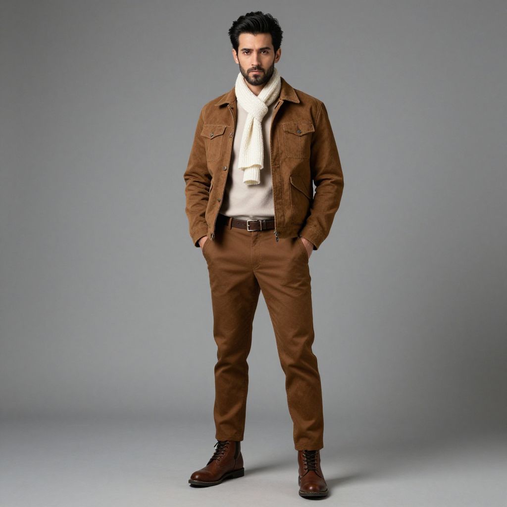 Man in Stylish Brown Suede Jacket and Scarf Autumn Fashion