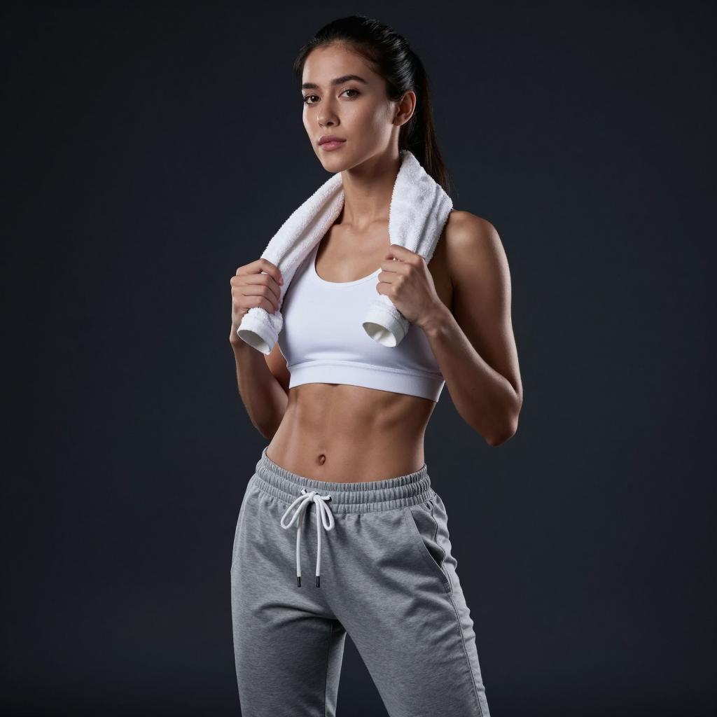 A fit young woman wearing a white sports bra and grey sweatpants poses confidently with a white towel draped around her neck, emphasizing her toned abs and athletic build. The photo has a clean, minimalistic style with a dark background that highlights her focused and strong demeanor.