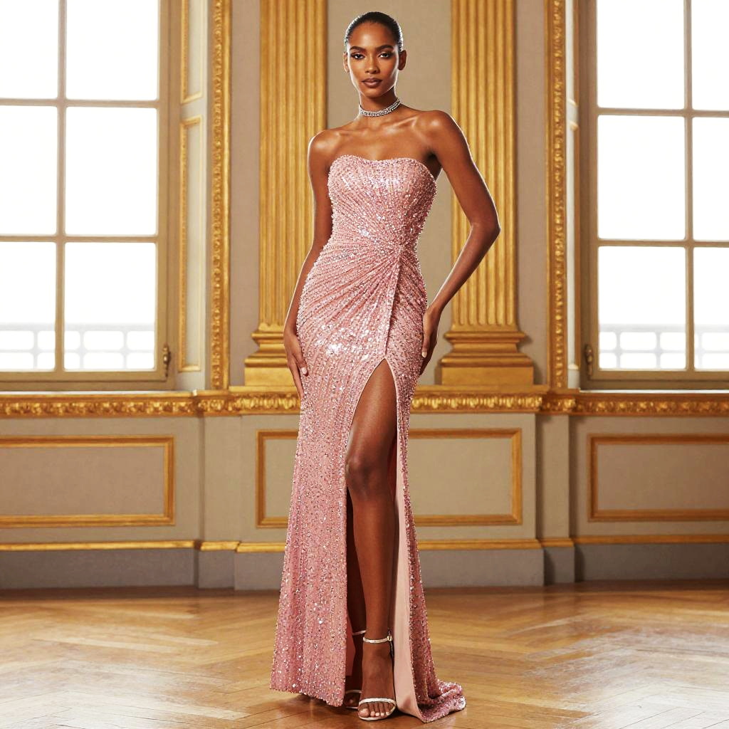 A confident woman poses elegantly in a stunning strapless pink sequin evening gown featuring a thigh-high slit, standing in a grand room with ornate gold-trimmed walls and large windows. The gown's shimmering fabric and fitted silhouette complement her poised demeanor, enhanced by a delicate choker necklace and high-heeled sandals.