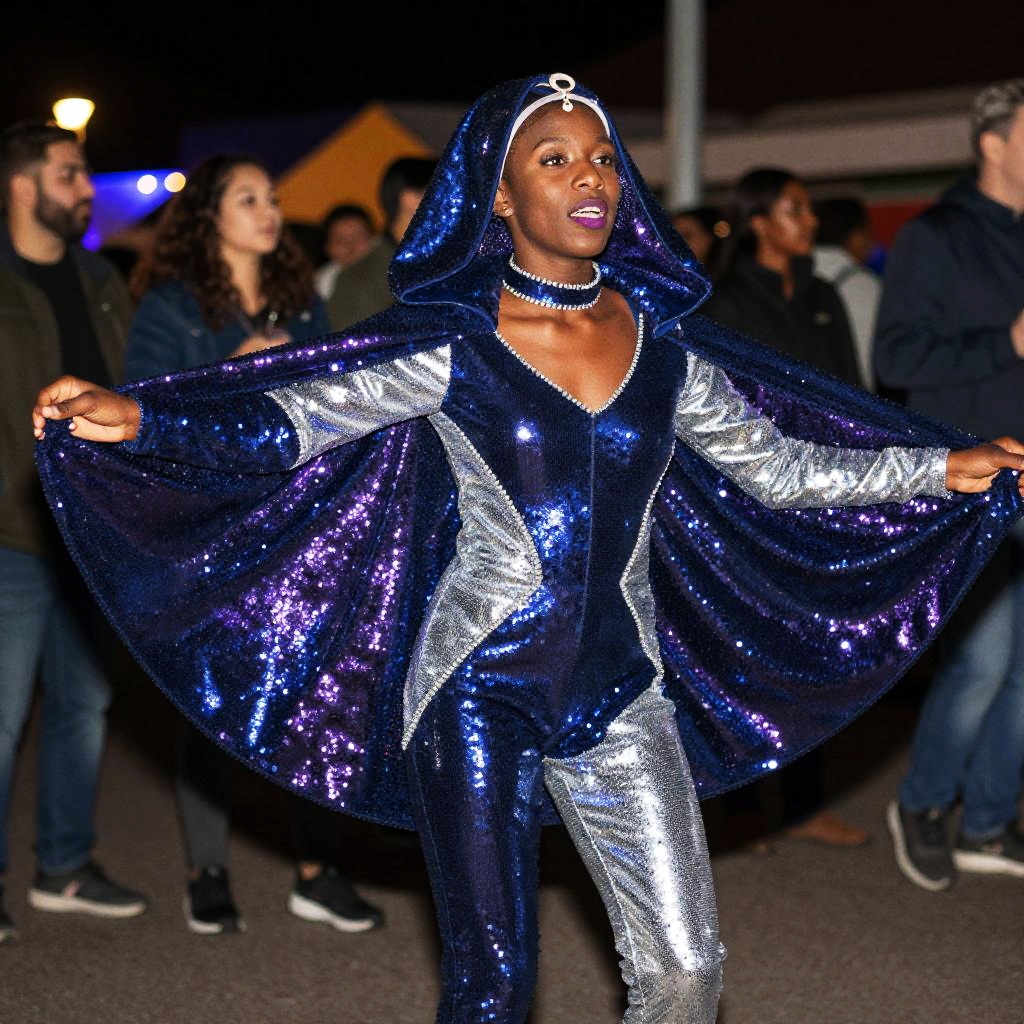 A woman dressed in a shimmering, futuristic blue and silver sequined costume with a hood and cape performs or poses at an outdoor nighttime event. Her confident expression and bold makeup complement the eye-catching, space-inspired outfit, reflecting a vibrant Gen Z style with a cosmic or sci-fi influence.