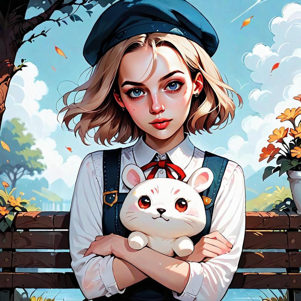 A young woman with blonde hair and blue eyes sits on a park bench holding a plush white mouse toy with large orange eyes. She wears a blue beret, a white shirt with a red ribbon, and overalls, set against a bright, clear sky with autumnal leaves and flowers around. This detailed digital illustration combines elements of anime and modern character art styles.