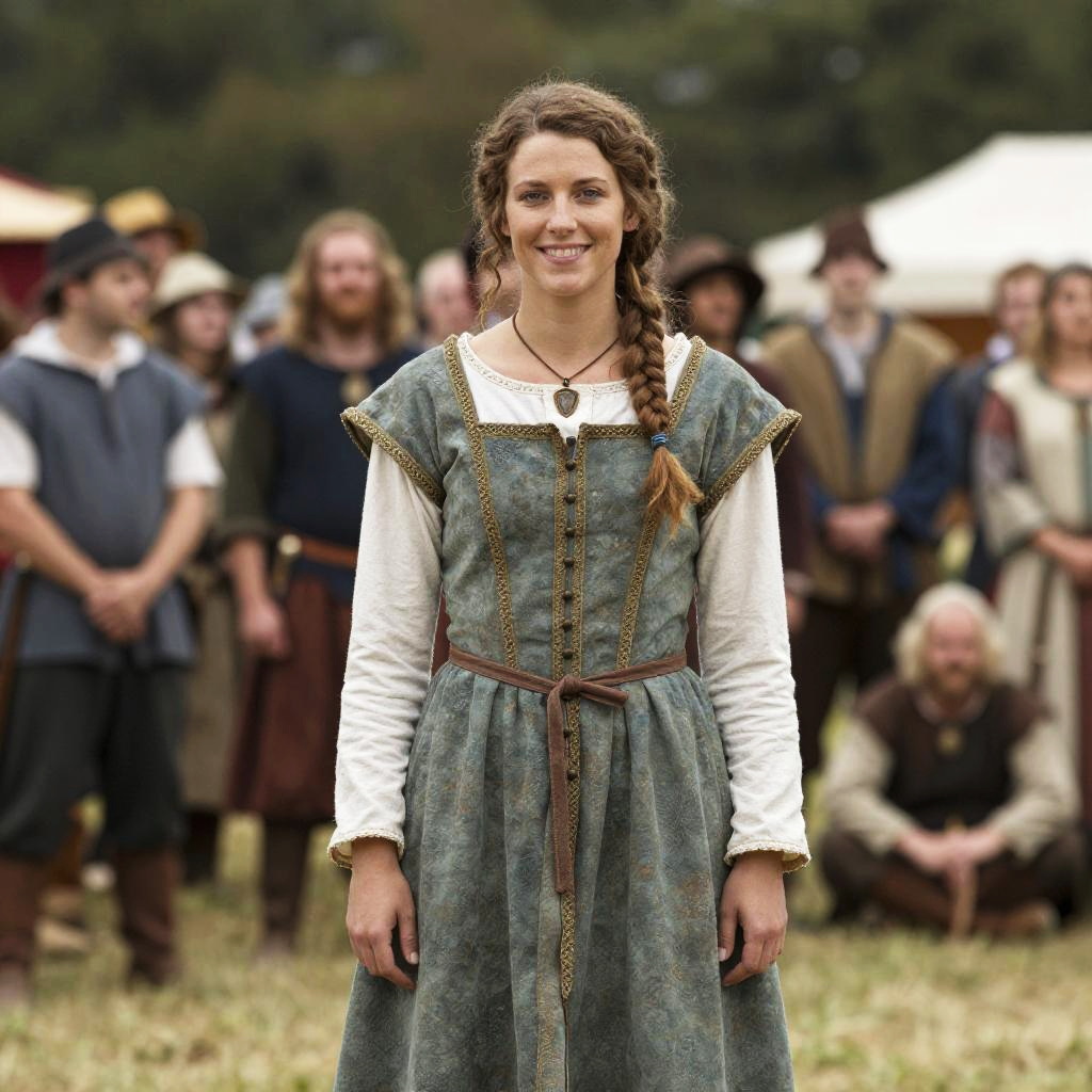 A smiling woman dressed in an authentic medieval-style gown stands confidently in front of a group of people at a Renaissance festival. The scene captures the essence of a historical reenactment, featuring traditional Renaissance clothing and a festive outdoor atmosphere.