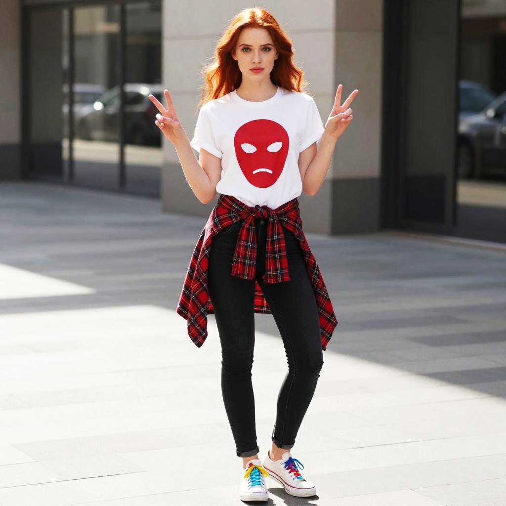 A young woman with red hair stands confidently outdoors, wearing a white t-shirt featuring a bold red sad face graphic. She pairs her outfit with black skinny jeans, a red plaid shirt tied around her waist, and colorful sneakers, striking a playful double peace sign pose. This casual urban style captures a mix of expressive streetwear and youthful attitude.