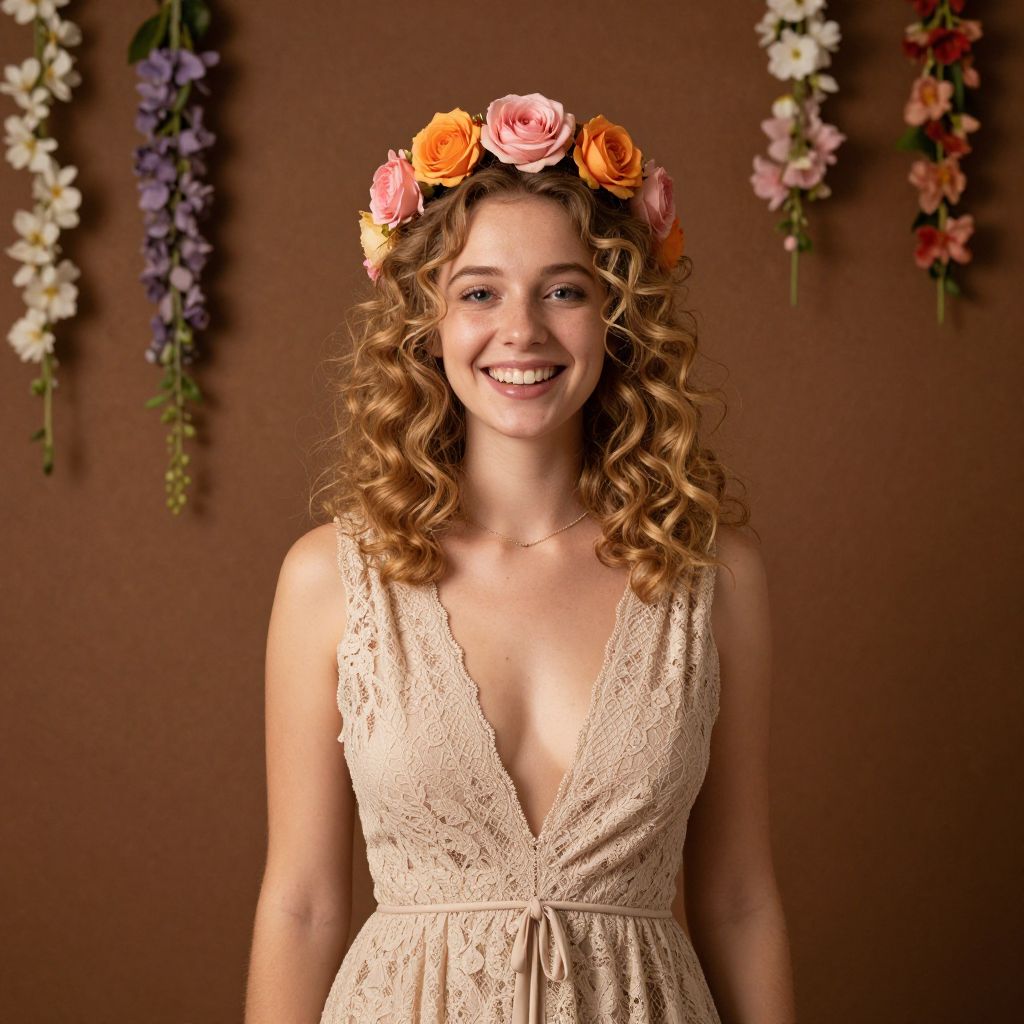Smiling Woman in Lace Dress with Floral Crown and Hanging Flowers