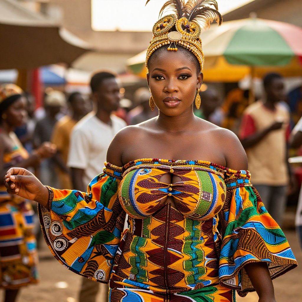 A confident woman dressed in vibrant African traditional attire poses gracefully in a lively market setting. Her colorful off-shoulder dress features intricate patterns, complemented by an ornate beaded headpiece and matching earrings, reflecting rich cultural heritage and modern elegance.