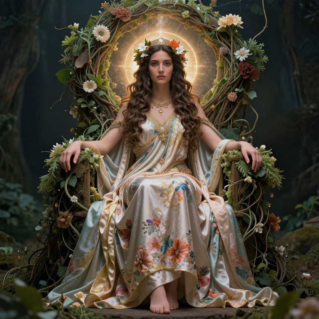 A regal woman dressed in an elaborate floral silk gown sits gracefully on a throne entwined with flowers and greenery, emanating an ethereal aura enhanced by the glowing halo behind her. This portrait captures a serene, mythical atmosphere with intricate attention to detail in the natural and royal motifs, blending fantasy and classical styles.
