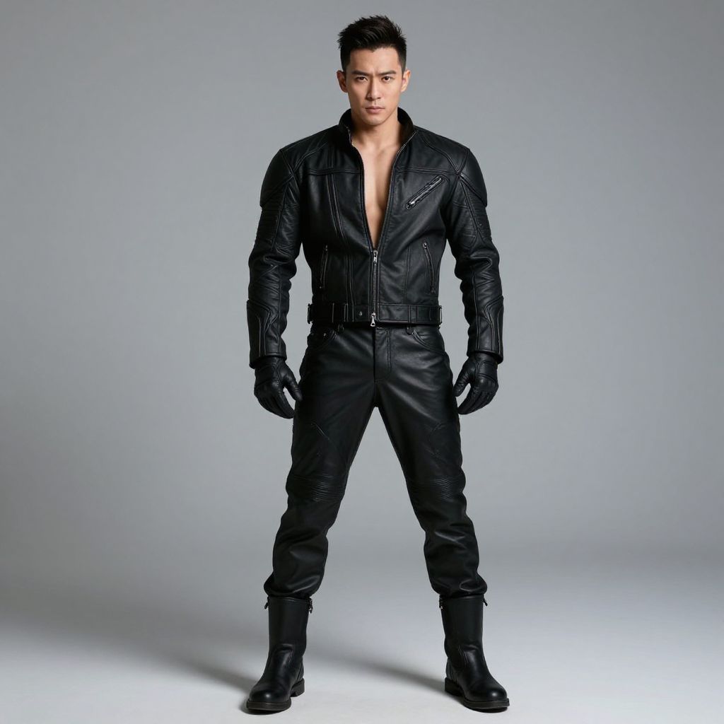 A confident man stands facing forward dressed in a sleek, black leather biker jacket and matching leather pants paired with gloves and boots. The outfit emphasizes a modern, edgy style with a slightly open zipper revealing a bold, rebellious attitude.