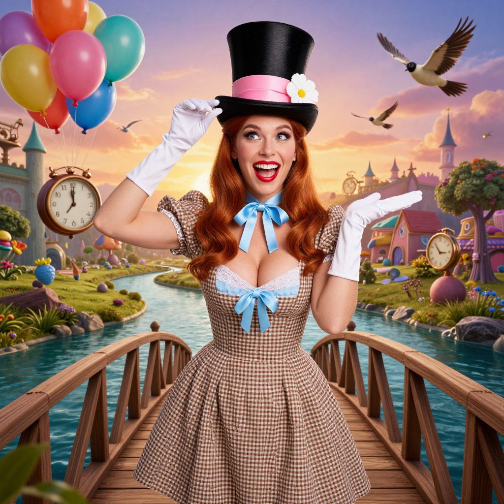 A cheerful woman dressed in vintage-inspired attire stands on a wooden bridge in a whimsical, fantasy-like landscape. She wears a checkered dress with blue ribbons, white gloves, and a tall black top hat adorned with a pink band and white daisy, surrounded by floating balloons and oversized clocks against a colorful cartoonish backdrop.