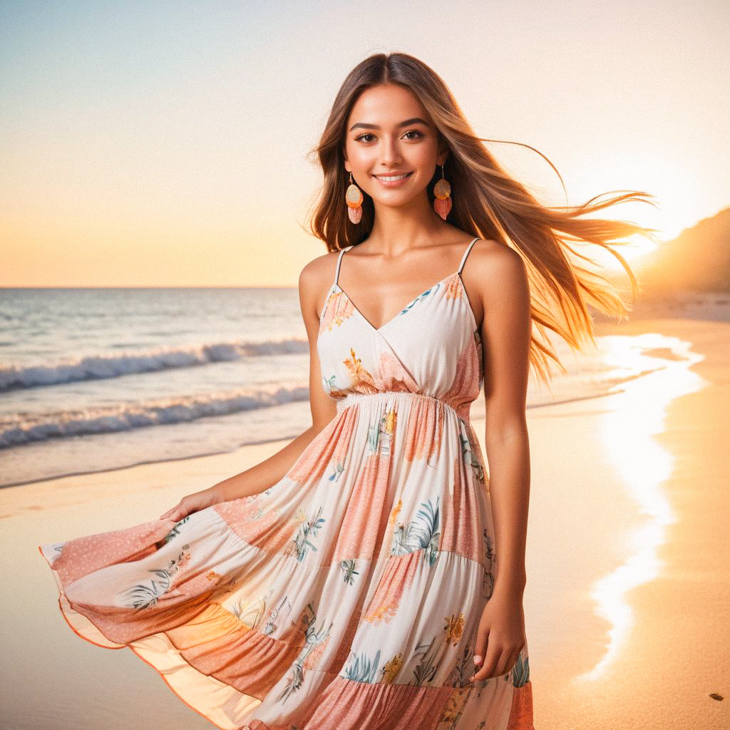 A serene moment captured on a beach during sunset, featuring a woman in a flowing, pastel dress that gently reflects the warm hues of the golden hour. Her hair dances with the breeze as she walks along the shoreline, embodying a sense of freedom and tranquility.