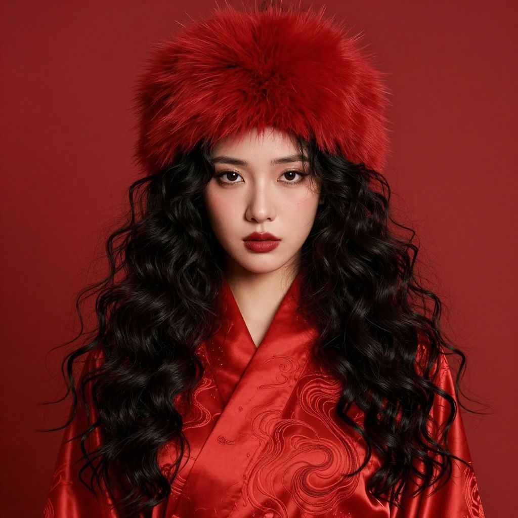 A striking portrait of a woman with long, voluminous black curls wearing a vibrant red fur hat and a luxurious silk red robe featuring intricate wave patterns. The rich red background enhances the dramatic and elegant atmosphere of the image, highlighting the harmonious blend of traditional and modern fashion elements.