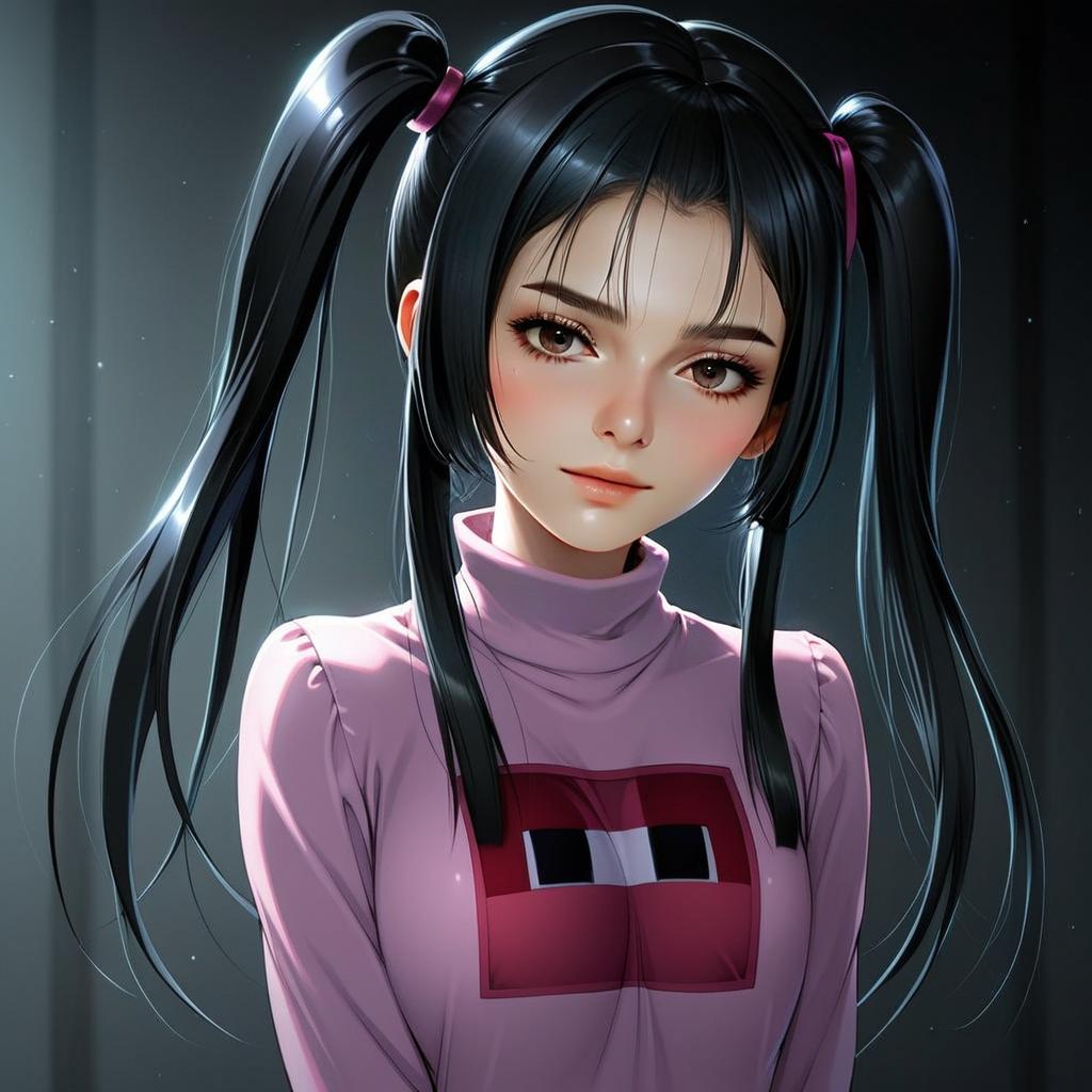 This digital illustration features a young woman with long, sleek black hair styled into twin ponytails secured by pink hair ties. She wears a stylish pink high-neck top with a graphic design on the chest, rendered in a polished and detailed anime-inspired art style with soft lighting and realistic skin texture.