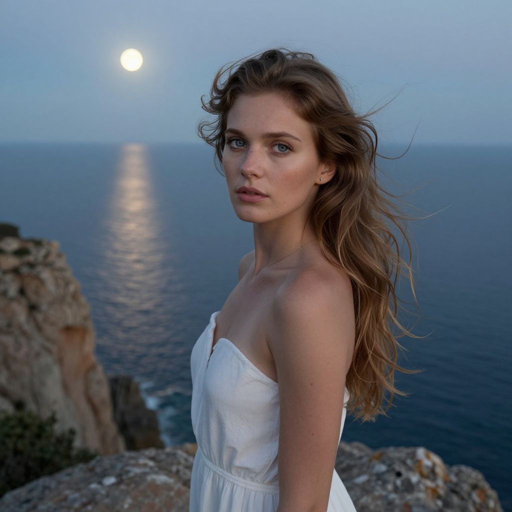 A young woman with flowing hair stands on a rocky cliff overlooking the ocean at dusk. The serene full moon casts a soft reflection on the water, creating a peaceful and dreamy atmosphere.