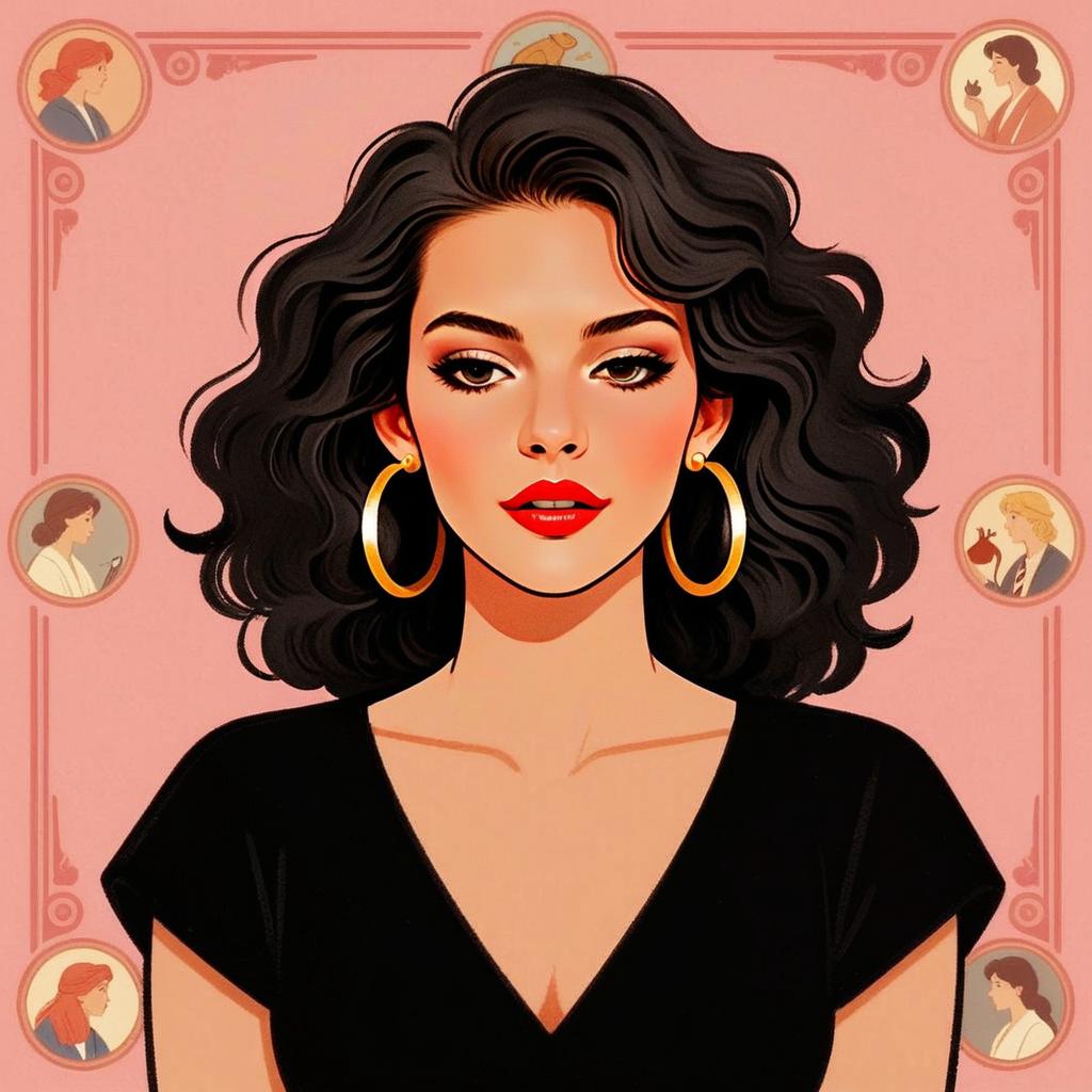 This digital illustration features a confident woman with voluminous black hair, large gold hoop earrings, and vibrant red lipstick, set against a soft pink background adorned with vintage-style cameo portraits. The composition highlights a stylish and modern aesthetic with a touch of retro influence, emphasizing the elegance and strength of the female subject.