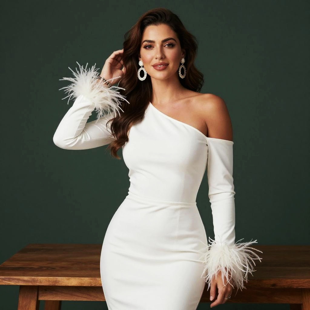 A confident woman poses elegantly in a fitted, off-shoulder white dress adorned with feathery cuffs. Her long, wavy hair cascades over one shoulder, complemented by statement earrings against a simple dark green background.