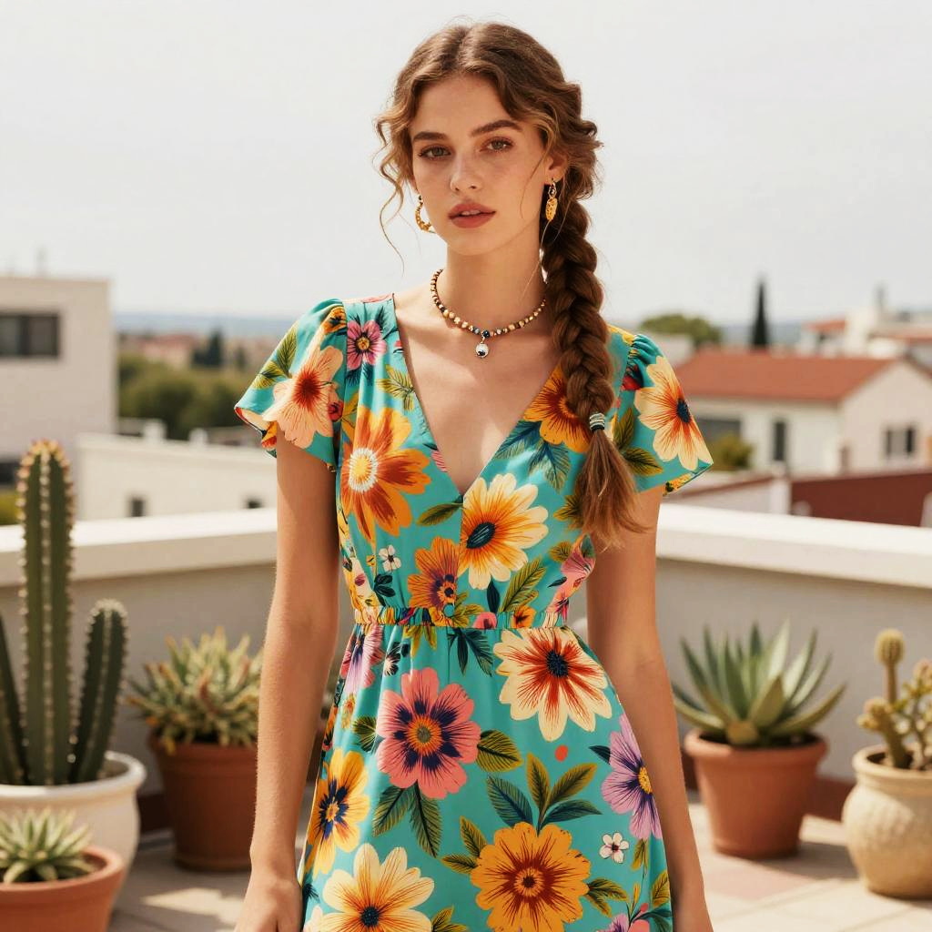 A young woman with wavy brown hair styled in a side braid wears a vibrant turquoise dress adorned with large yellow, orange, and pink floral patterns. She stands on a rooftop terrace decorated with various potted succulents and cacti, exuding a fresh and summery vibe, perfect for Gen Z fashion trends.