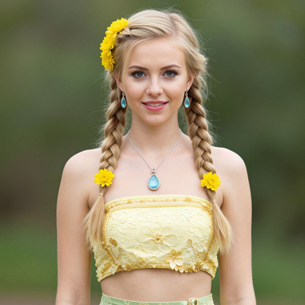 Blonde Woman with Braided Hair and Yellow Flower Embellished Crop Top
