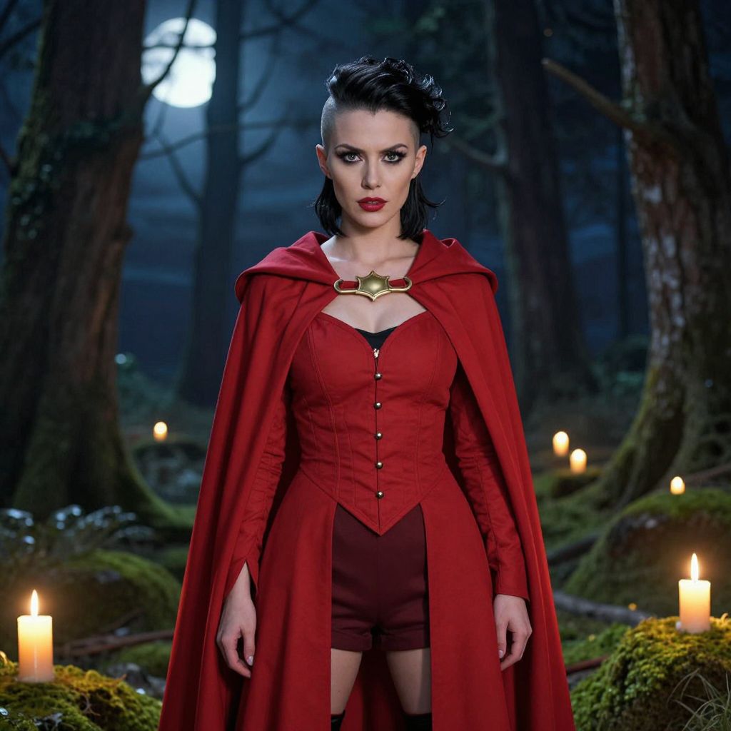A woman with a striking undercut hairstyle stands confidently in a dark forest illuminated by candlelight and a full moon. She wears a bold red cape and corset, giving her a powerful and mysterious presence reminiscent of gothic fantasy or supernatural themes.