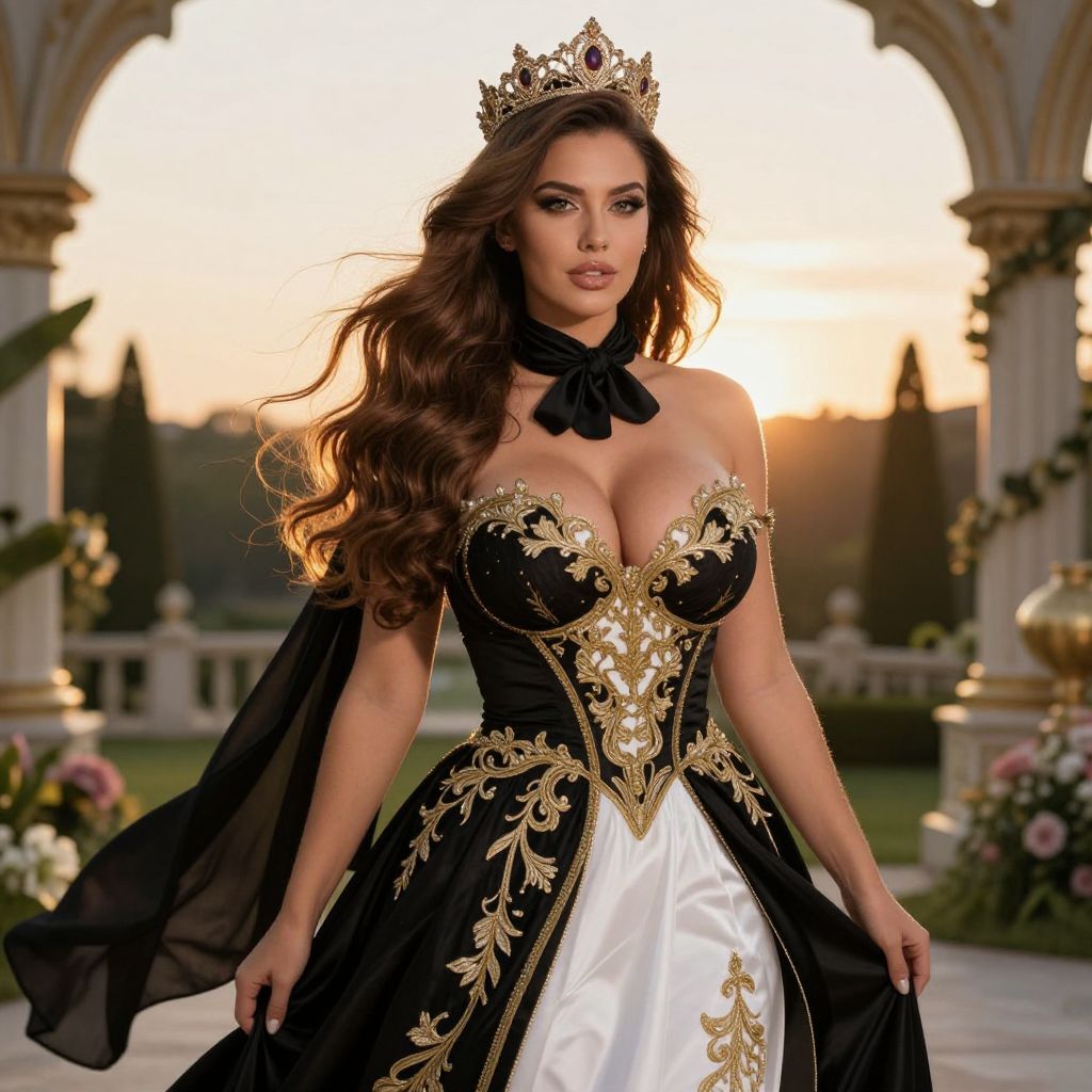 A regal woman poses elegantly outdoors at sunset, wearing an ornate black and white gown adorned with intricate gold embroidery. She complements her luxurious look with a jeweled crown and flowing hair, embodying a royal and glamorous aesthetic in a stately architectural setting.