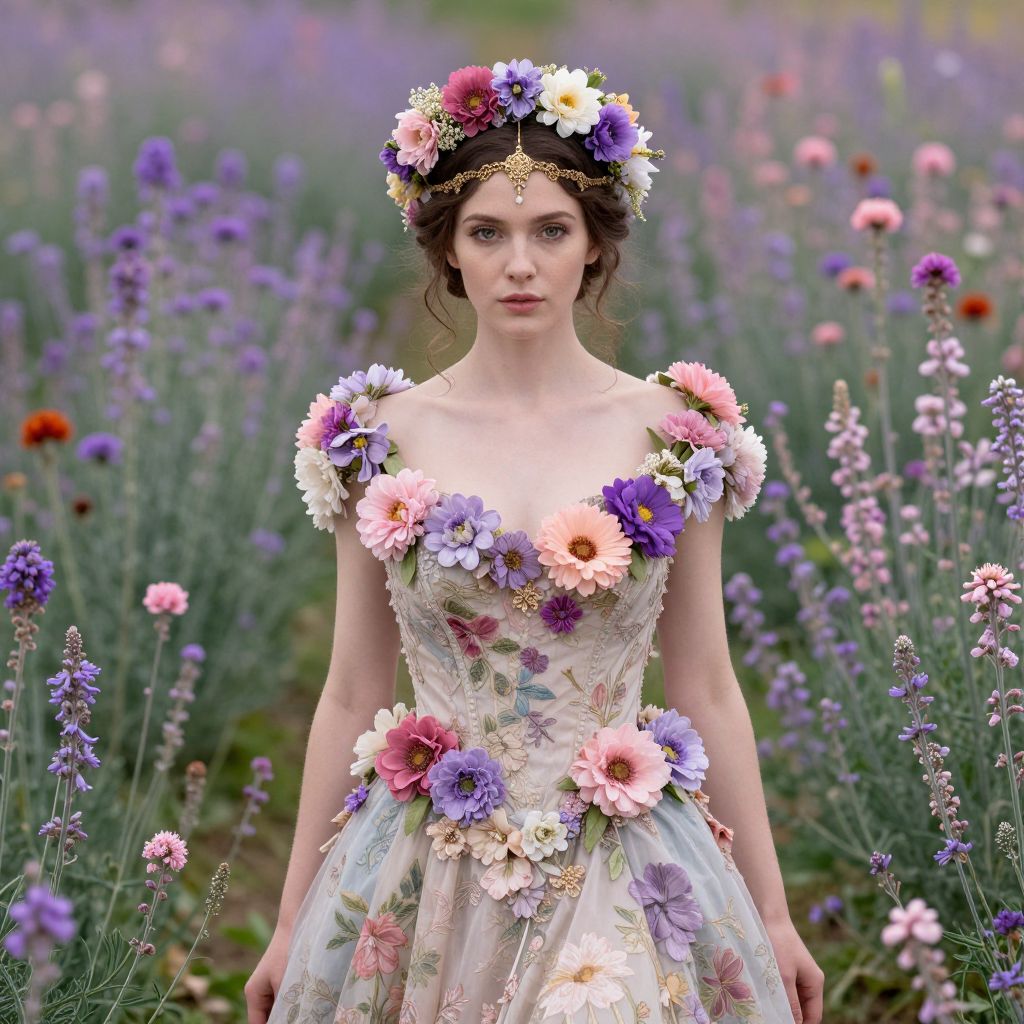 A young woman stands gracefully in a lavender field, wearing an elegant floral gown adorned with pastel flowers and intricate embroidery. Her look is complemented by a matching flower crown and delicate golden headpiece, creating a whimsical, ethereal atmosphere.