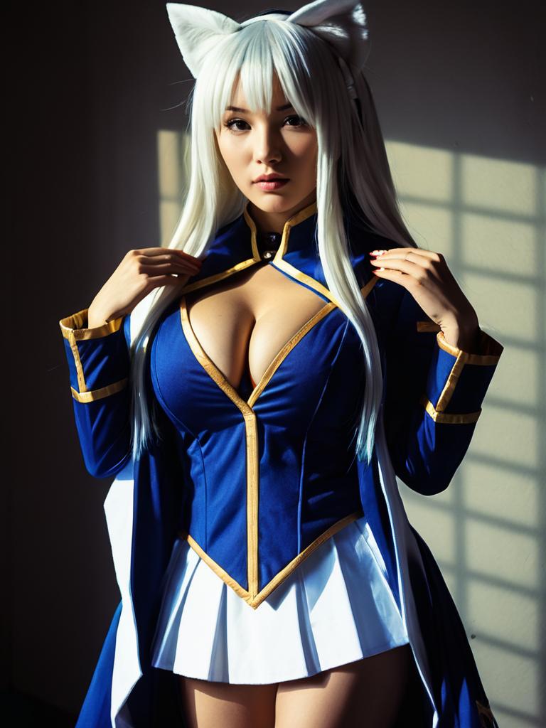 Sexy Woman Cosplaying Rumiho Akiha Faris Character in Blue and White Costume