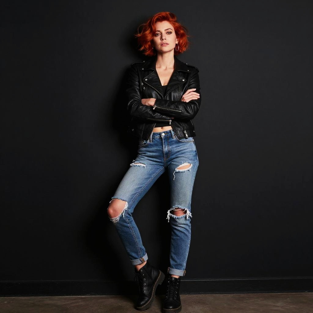 A confident young woman with vibrant red hair poses against a dark background wearing a black leather jacket, ripped blue jeans, and black boots. Her edgy street style and relaxed posture encapsulate a modern, rebellious Gen Z fashion vibe.