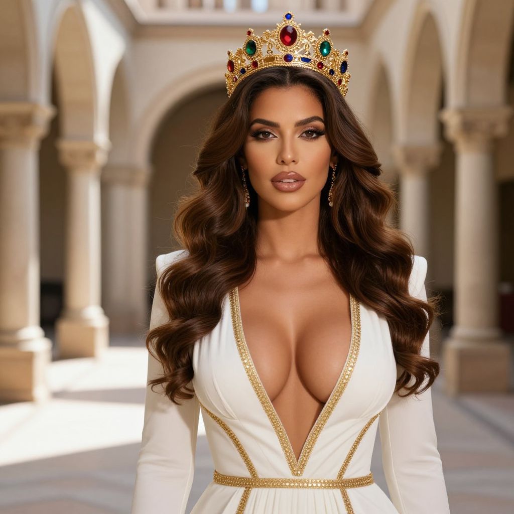 A regal woman poses elegantly in a white gown with gold trim, accentuated by a deep V neckline. She wears a golden crown adorned with colorful jewels, standing confidently in a grand architectural setting with arches and columns, radiating grace and sophistication.