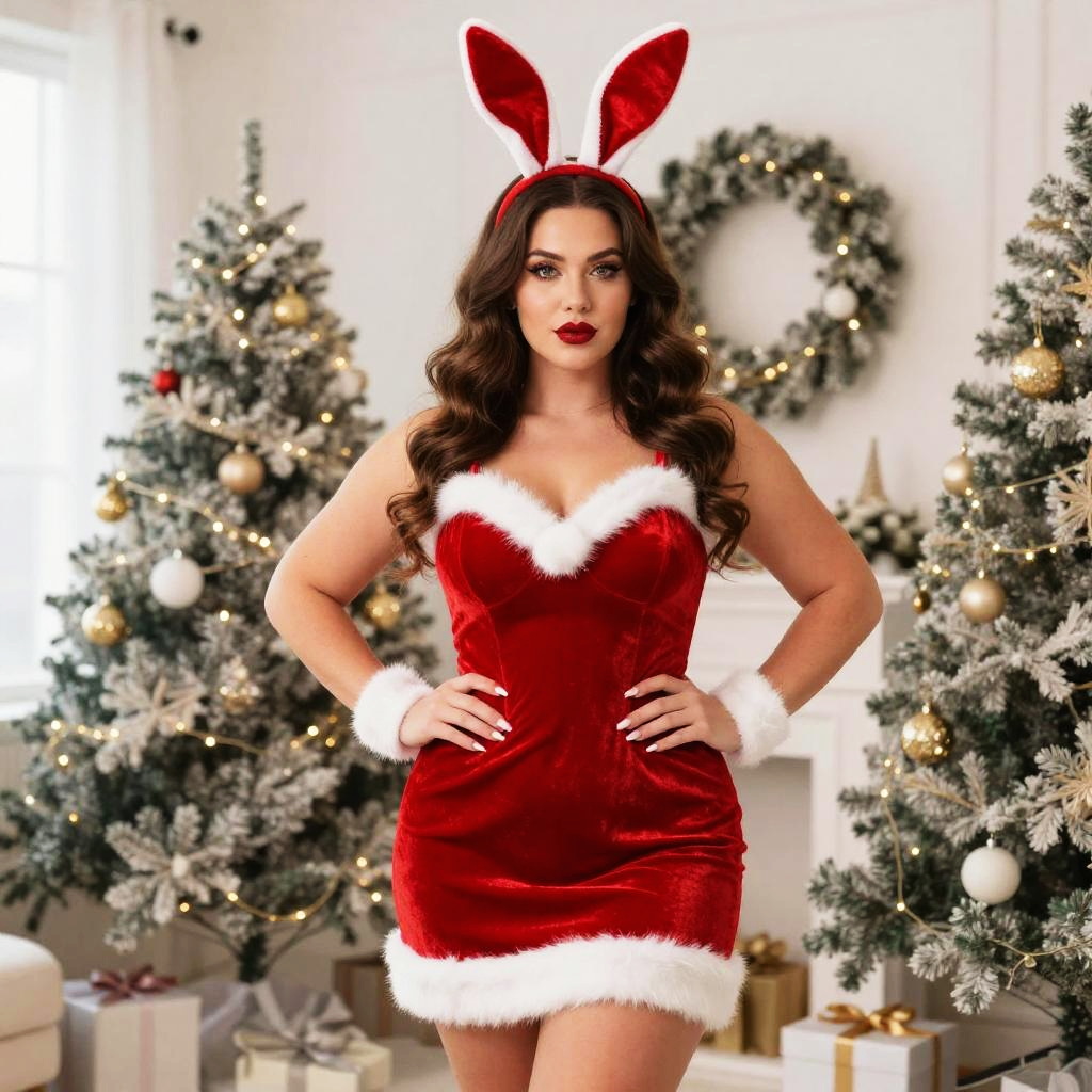 A confident woman in a festive red velvet Santa-inspired dress with white fur trim poses with her hands on her hips, wearing matching red and white bunny ears and wrist cuffs. The holiday-themed setting features decorated Christmas trees with gold and white ornaments and wrapped gifts, evoking a glamorous and playful Christmas vibe.