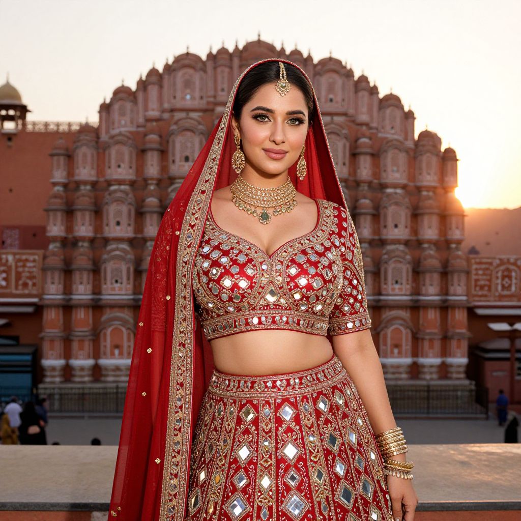 A woman dressed in a stunning traditional red Indian lehenga adorned with intricate mirror work and gold embroidery stands confidently in front of the iconic Hawa Mahal in Jaipur. The warm sunset casts a golden glow, highlighting the rich cultural heritage expressed through her jewelry and attire.